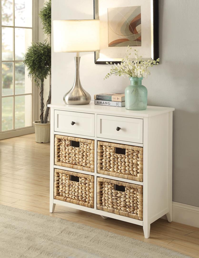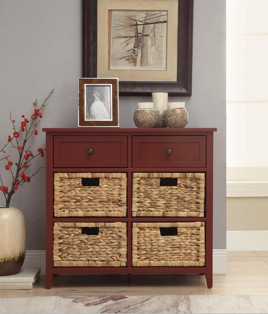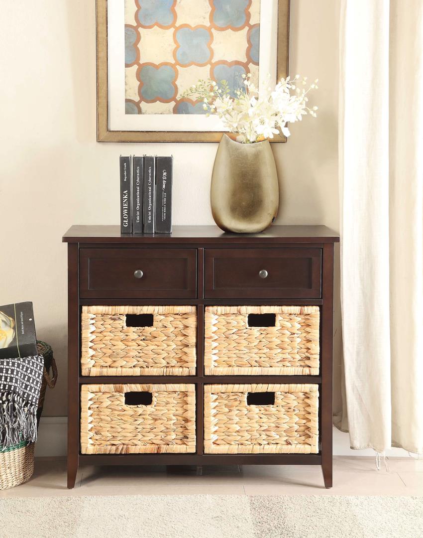 Get exceptional value on this transitional Filbert chest. Featuring a rich finish, the drawers and open compartment spaces give plenty of room for storage. The table looks great with or without the included wicker crate baskets. Some Assembly Required.