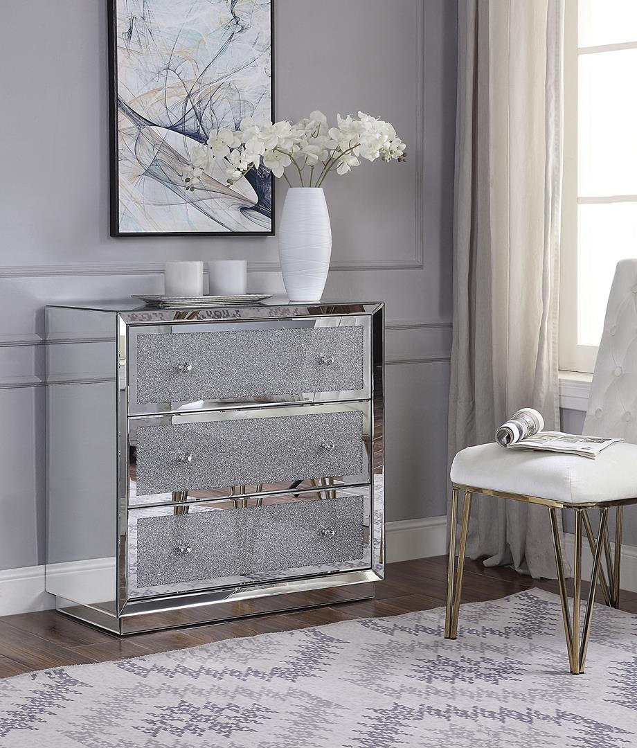 - Mirrored Top, Front Drawers with Faux Crystals Inlay