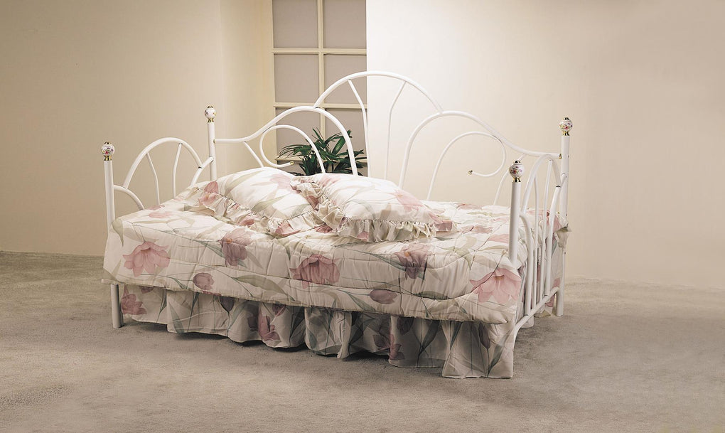 The Provence daybed display delicate elegance through the arched, curled accents and round finials. Also featuring detailed porcelain knobs on top of posts for added beauty. The metal design is sure to grab attention and can fit into many areas of your home. Connecting rail or mattress is not included.