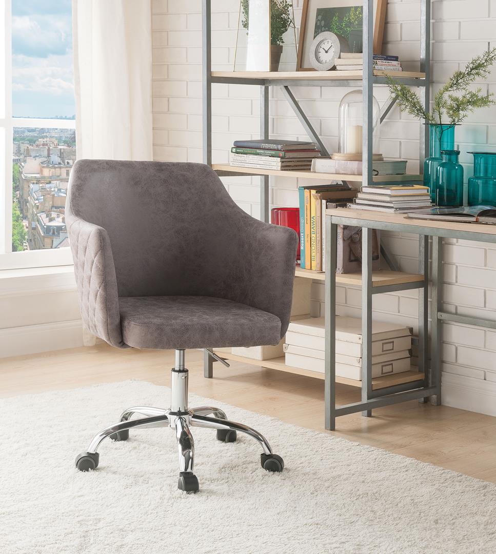 The Cosgair office chair demands attention by drawing on the elegance and attitude of classic design. With a comfortable seat, sleek high-arms, and chrome metal base with gas lift and caster wheels to add mobility, this piece will be a suitable choice for your home office. Available in champagne velvet and brown faux leather, this piece offers a blend of modern style with lasting quality.