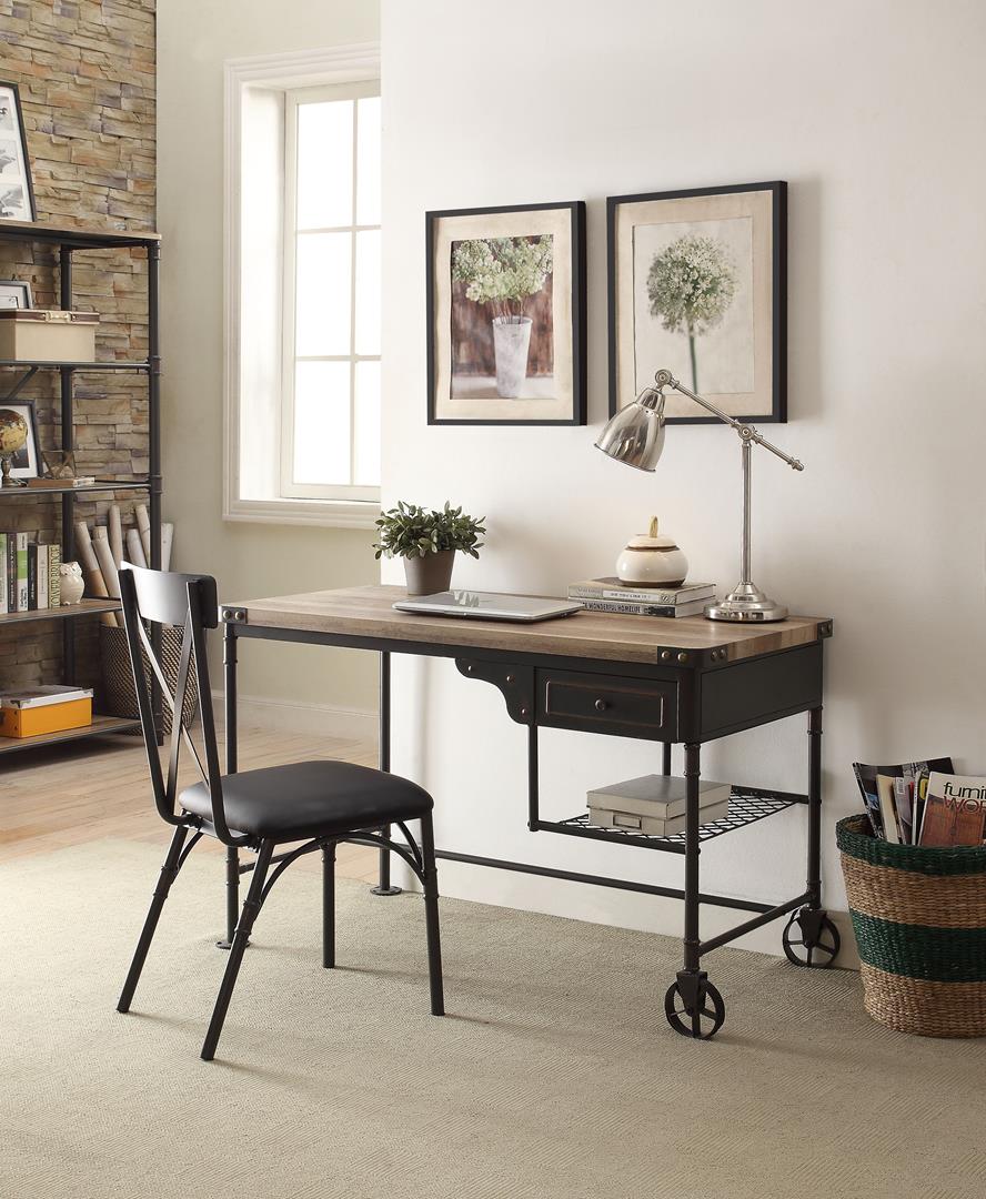 Bring a touch of industrial style into your home with the Itzel desk, with its antique oak finished top with 1 drawer & 1 shelf. It will serve as the perfect place to hold all of your often used supplies. The base is made up of 2 wheel designed legs finished in sandy gray to emphasize this modern task desk.