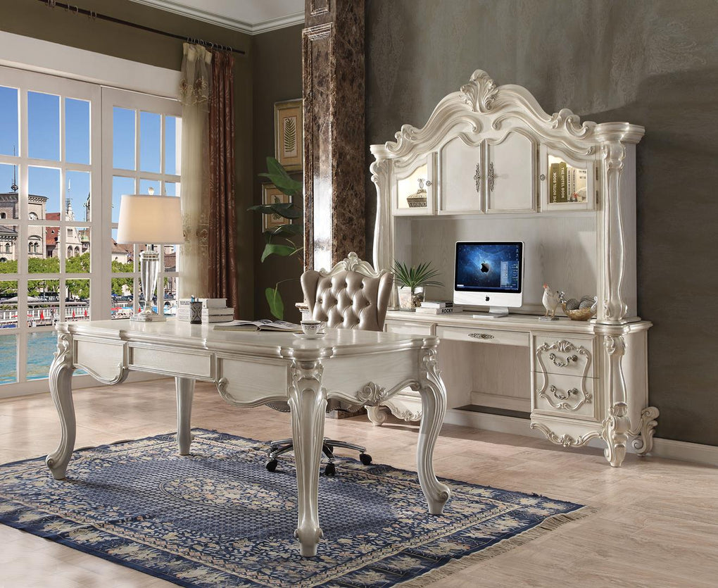 The Versailles office set was inspired by old European design. This collection features carved scrollwork accent with antique hand-brushed finish. The accent pieces crafted in wood with bone white finish and also included regal features such as ample storage and silver finish hardware. This office set will give you a royal sensation in your study.