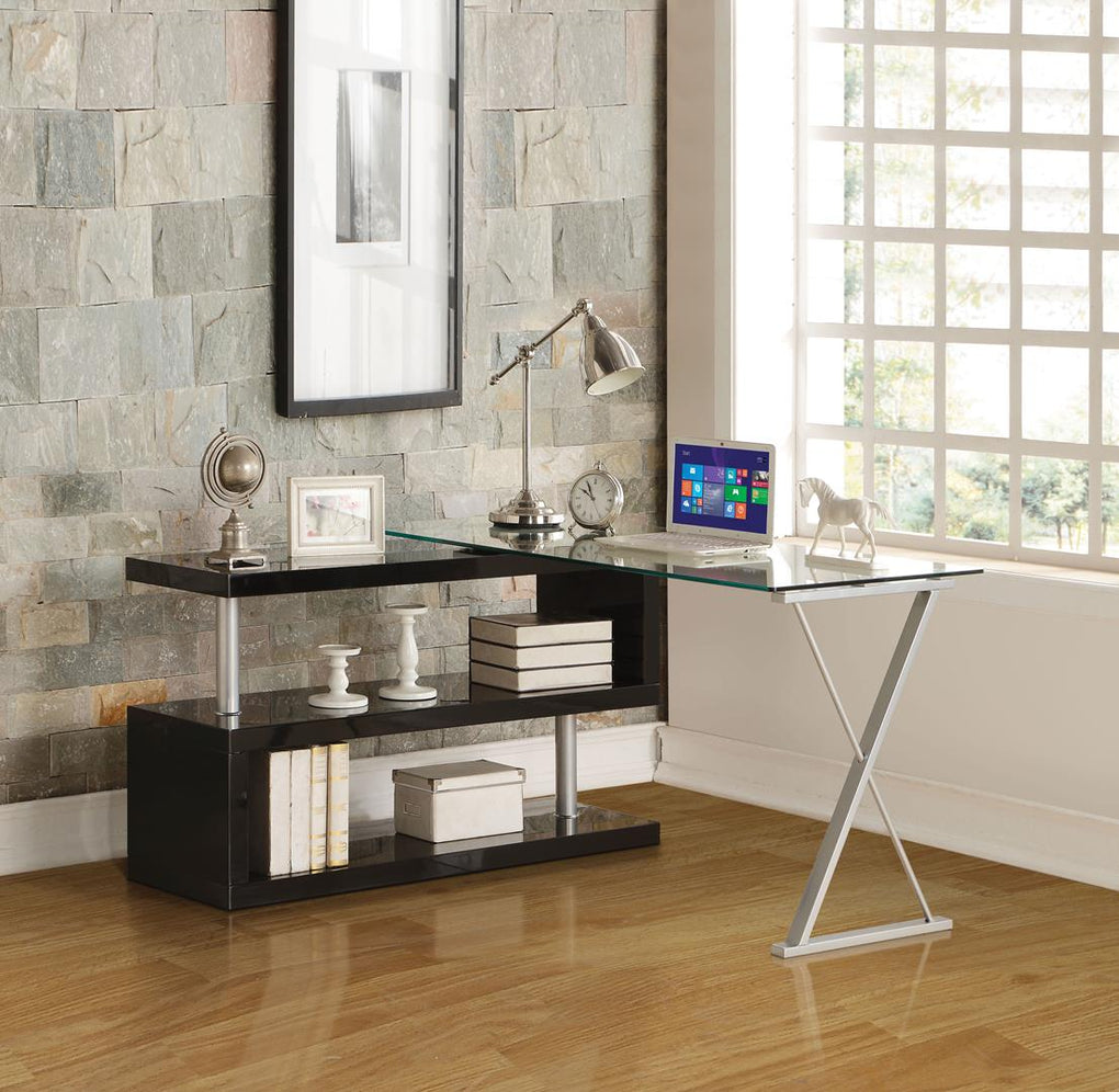 The Buck desk is loaded with features of use and function. Not only does it have the capability of being set up for left or right configuration, it boasts a offset designed corner end with 3 display surfaces and can be seen from any view with the main desk top being glass surface. The end support leg is tastefully designed using round rod piercing a rectangular metal leg. The desk is also offered in black or white.