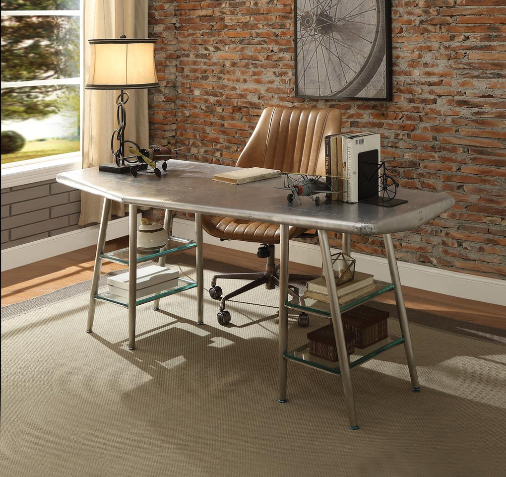 The Brancaster desk is designed with a modern look and industrial styling. This desk features patchwork of aluminum accented with four glass shelves built into the legs of the metal sawhorse base. Add this desk to your home for a luxurious multipurpose addition.