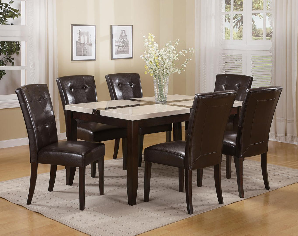 The transitional dining chairs collection features cut-out geometric pattern backrest, leather like upholstery and walnut tapered legs. This stylish collection is completely original, crafted with selected materials will be perfect match for your dining room.