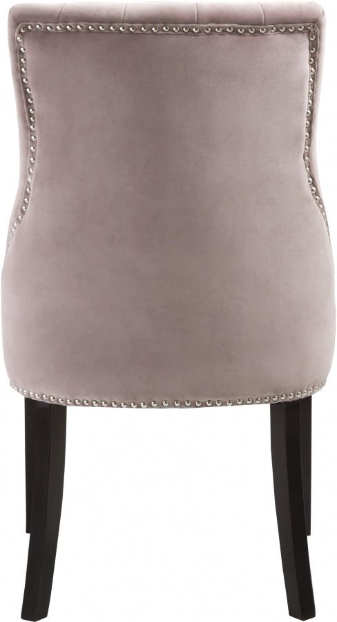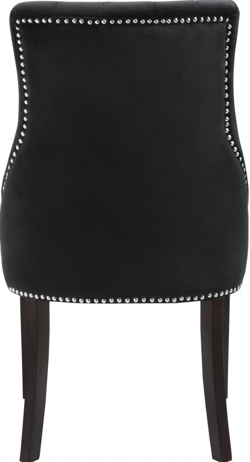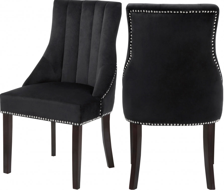 Dine in luxurious style with the Oxford velvet dining chair. Featuring a curved high back, plush cushioned seat and deep tufted velvet upholstery studded with chrome nailheads, this dining chair is sure to take your dining experience to a whole new level. Espresso wood legs provide sturdy support and complement the stunning upholstery for a sleek, contemporary design.