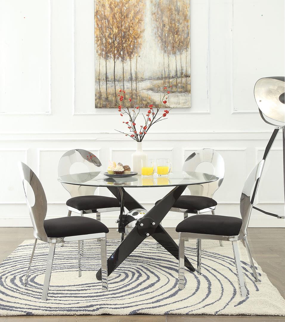 The chic design of the Hagelin dining set offers a newfound elegance to your home. Its metal construction is as lovely as it is sturdy. Featuring a tempered glass table top supported by a propeller style base and matching chairs include padded seat cushion with round cut-out backrest.