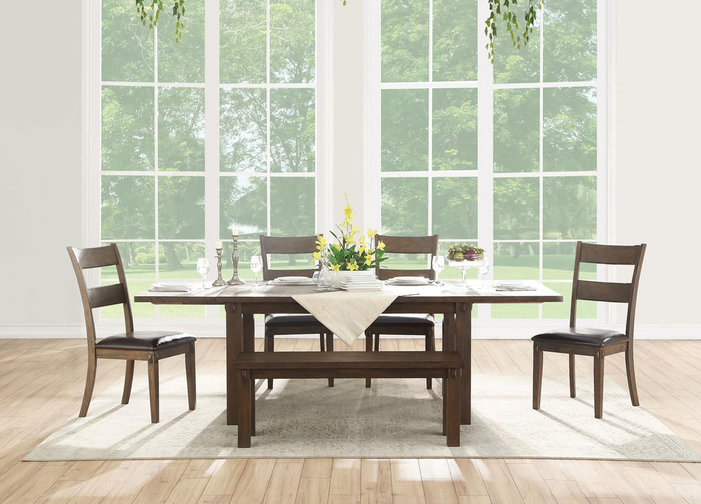 Create a beautiful interior dining space with the stylish Nabirye dining room collection. This sophisticated dining room table has matching case pieces including a backless bench and armless ladder-back chairs with tapered legs and PU upholstered seat cushions. This stylish and detailed collection is ideal for a large gathering and will add elegance to any dining room Decor.