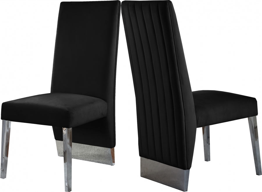 Set the standard for elegance in your dining room with this Porsha Dining Chair. A high back design with a slight slant creates an enviable silhouette and air of sophistication. Velvet upholstery in a rich shade of black adds to the beautiful look of this exquisite chair. Channel tufting keeps the soft padding of the chair aloft, so it retains its comfort factor through repeat use. Chrome metal legs finish up the design, providing sturdy support and a modern edge.