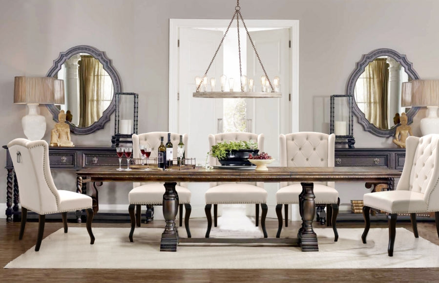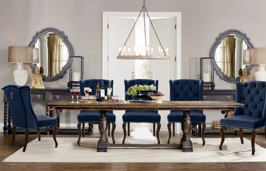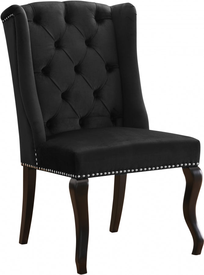 Bring luxury to mealtime with the Suri Black Velvet Dining Chair. This chair has a curvy, high back with an elegant look that blends modern with traditional. The back is tufted to prevent shifting of the padded cushion, and the chair has chrome nail head trim for added beauty and resilience. A chair knocker on the back lends an extra element of elegance to the design, and the wooden legs provide sturdy support and complete the design on a timeless note.