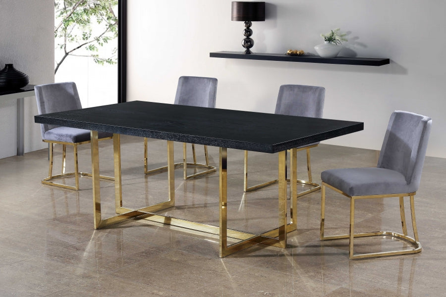 Lend your dining room a Hollywood-inspired vibe with this chic Heidi Black Velvet Dining Chair. This pretty chair features velvety smooth upholstery on its back and seat cushions to comfort and pamper guests while they enjoy their meals. The black velvet and gold metal combination ensures that you make a big statement in your space. The metal frame has a polished gold finish that adds to the lavish look of this armless chair.