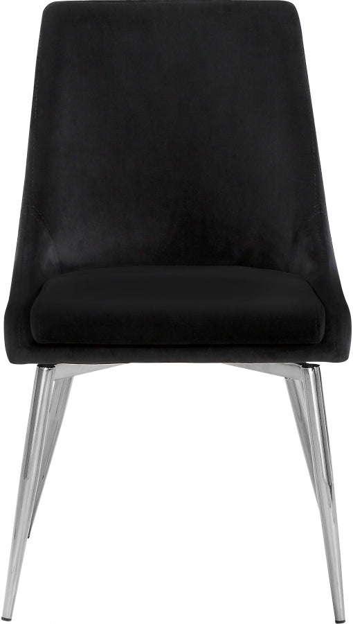 Extend contemporary panache to the dining room with this Karina Black Velvet Dining Chair. This dining chair features upholstery in sleek black velvet for a modern look and has an armless design for a retro-inspired vibe. The stark black color makes it easy to blend in with your existing decor colors or make a contrasting statement with ease. The slanted legs of this chair are chrome finished for added modernity and to provide reliable and durable support while you dine.