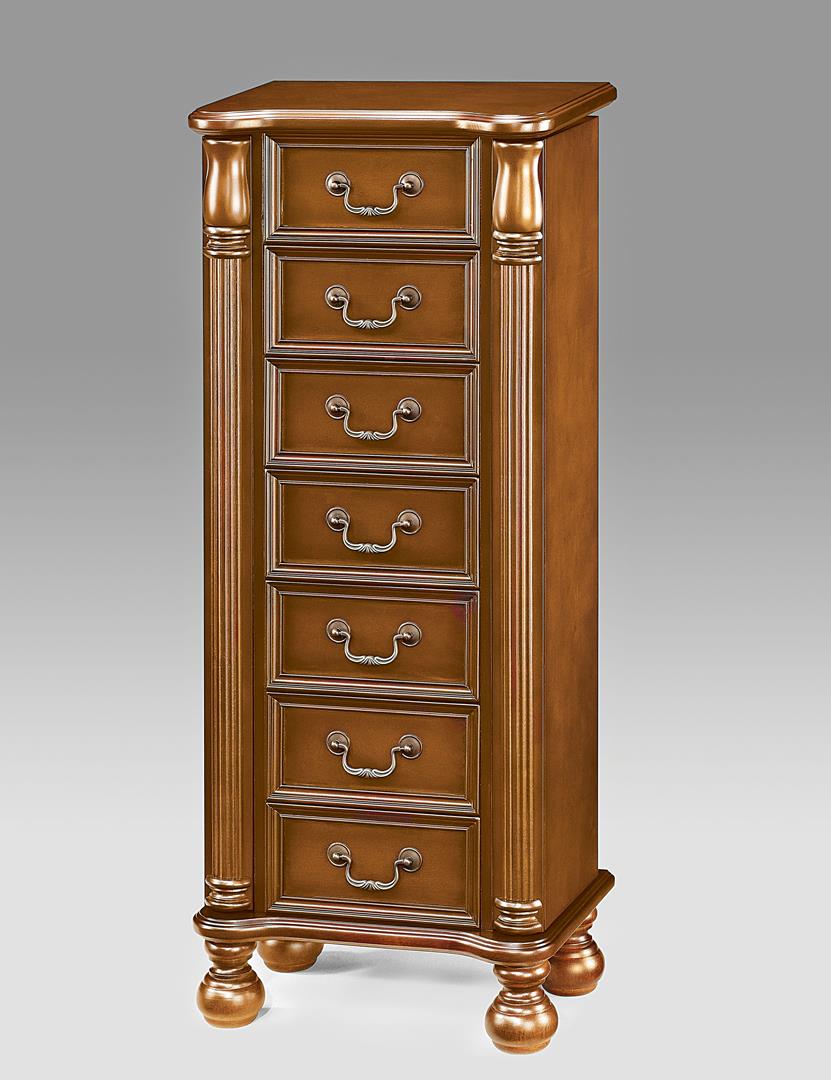 The Lopez Jewelry Armoire will be a functional and stylish addition to any bedroom. Handsomely Crafted in warm Oak Finish, composed from selected woods and veneers. Features: Storage Drawers perfect to keep small items organized; the top cover opens up to reveal a hidden mirror and multiple jewelry storage compartments; two side jewelry storage doors include hooks for necklaces; both top & door jewelry storage are complemented with Felt-Lined to keep jewelry safe and protected.