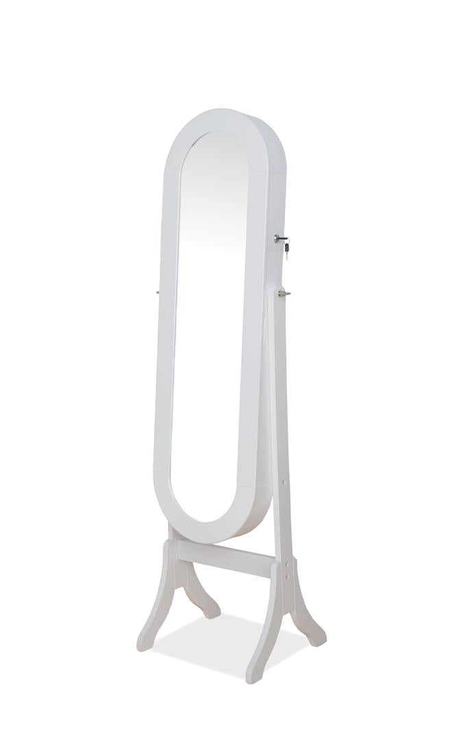 The Jalyn Jewelry Armoire will be a functional and stylish addition to any bedroom. Handsomely Crafted in White Finish and composed from selected woods and veneers. Features a Tilt Floor Mirror Door that opens up to reveal multiple storage compartments and hooks, and complemented with dark Felt-Lined. This Jewelry Armoire is perfect to keep jewelry organized, safe and protected.