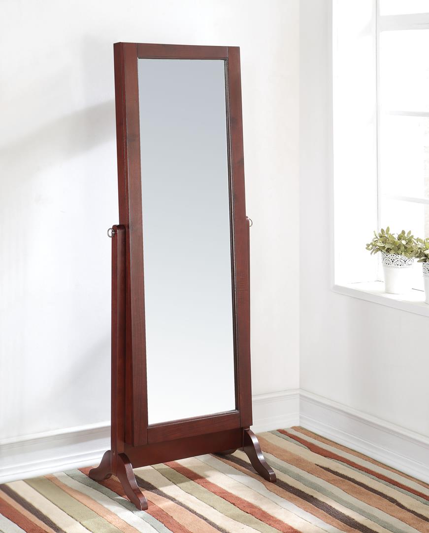 The elegant and function Remiro Jewelry Armoire is the ideal jewelry cabinet to store and organize one's valuables with greater ease. This cherry finish wood free standing floor mirror features built in storage behind the mirror. The tilting armoire mirror is felt lined and has a lock and key to keep all of its valuable contents safe and secure. Enhance any room Decor with this stylish, transitional accent piece.