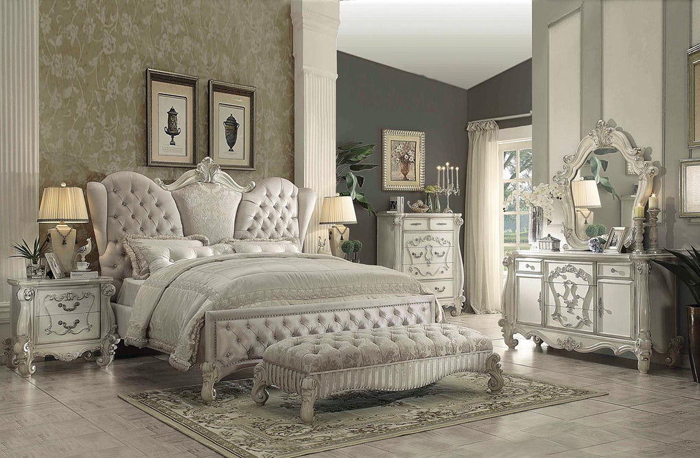 The Versailles dresser is the perfect accent to create the style of royalty your bedroom has been needing. This dresser crafted in wood with bone white finish was inspired by old European design with brown copper metal hardware and intricate wood carvings on the front of the five drawers and two doors.