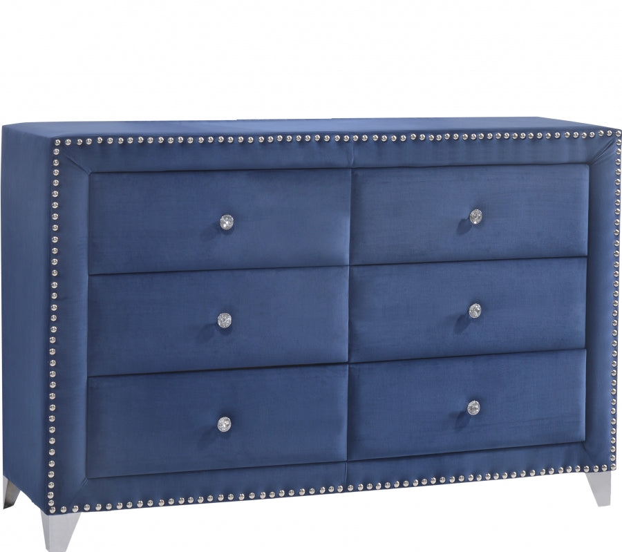 The Caroline Bedroom Set, By Meridian Furniture. This beautiful bed features a custom design upholstered in a beautiful velvet fabric. Garnished with crystal tufting and a nail head trim, this bedroom set is guaranteed to make you feel like royalty.