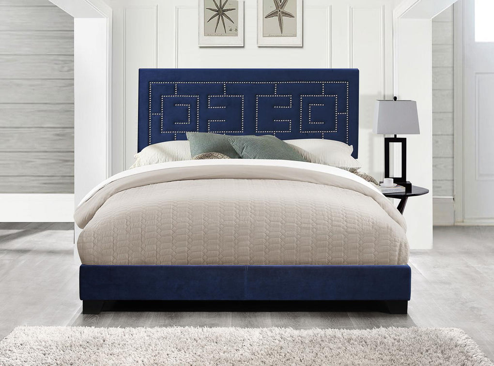 The Ishiko III bed provides a commanding presence in any room. This contemporary panel bed features a fully padded rectangular headboard with low profile footboard in a luxurious dark blue velvet. The headboard is accented with geometrically patterned nailhead trim in a chrome finish. The bed's clean line design will go with various styles of case good finishes and will become the focal point in any bedroom.