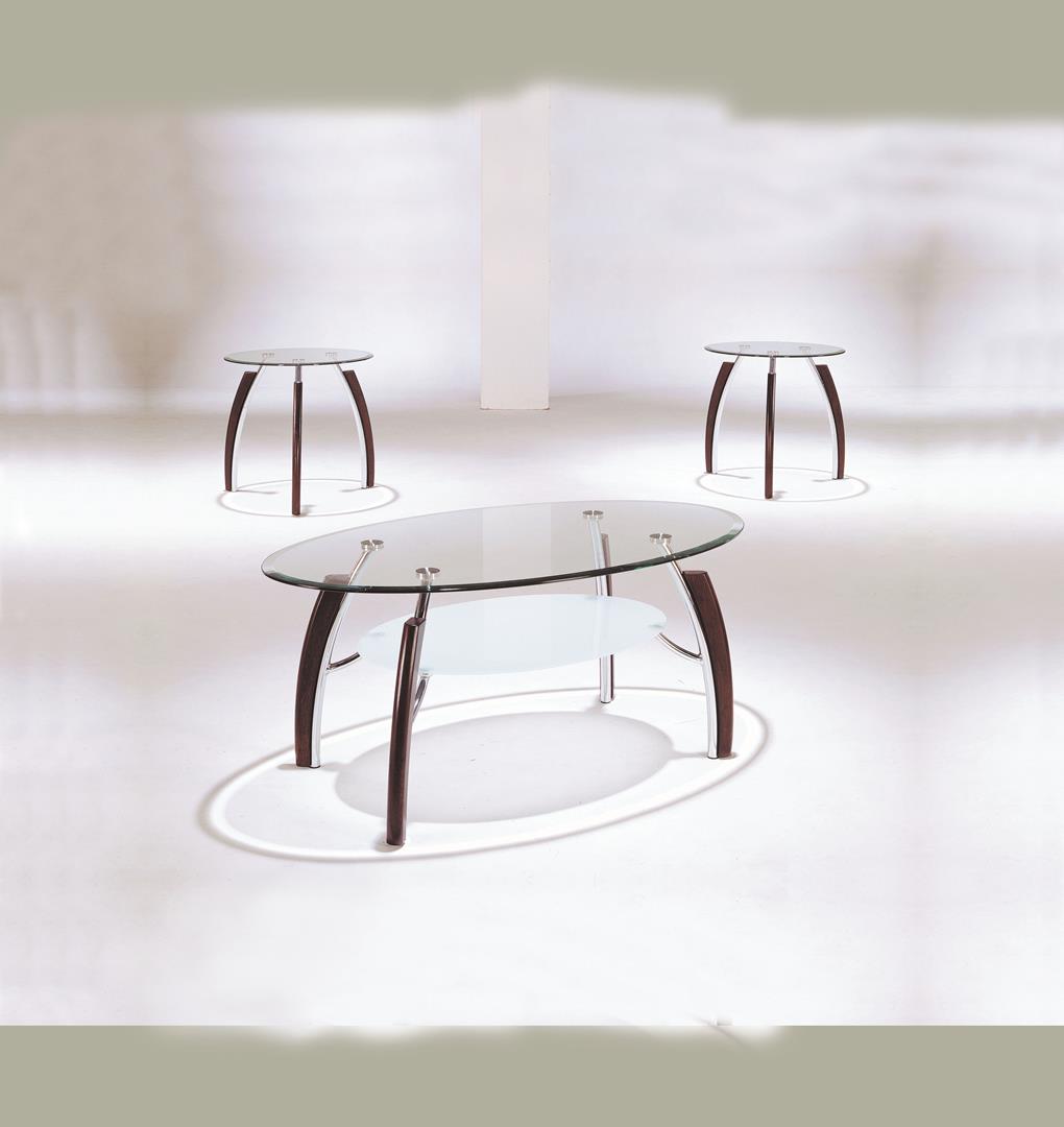 The Martini 3Pc Coffee/End set includes an oval-shaped coffee table and two matching end tables. Each piece features a clear tempered glass top with a beveled rim. Curved, claw like feet support the set, comprised of wood and metal. The wood is finished in cherry while the metal has a polished chrome finish. An oval-shaped lower shelf is incorporated into the coffee table design, made from frosted glass.