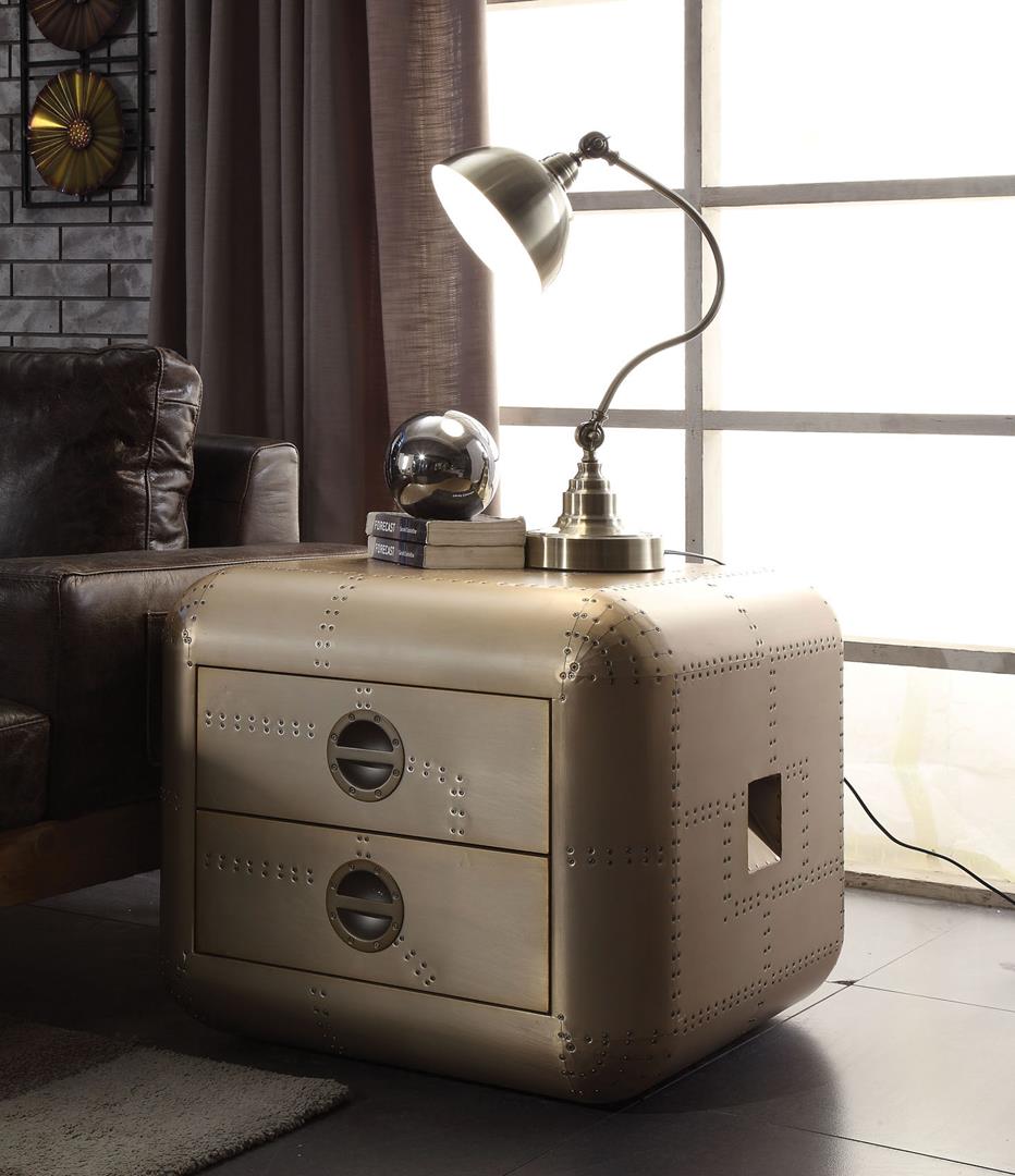 Redefine your space with a modern look and industrial styling with the Jennavieve End table. This square trunk style coffee table features magnificent gold aluminum patchwork with 20th-century riveting details. The table is accented with a large storage drawer and rounded corners giving it sleek aerodynamic lines. This beautiful accent table will modernize any space you place it.