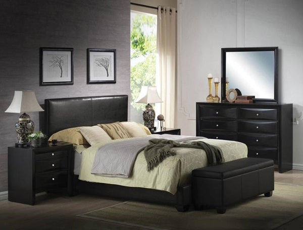The Ireland bedroom collection reflects transitional design with a beautiful button tufted headboard, crafted in selected faux leather material. Complemented by storage cases carefully made with hand selected veneers with beveled front drawers and brushed nickel hardware.