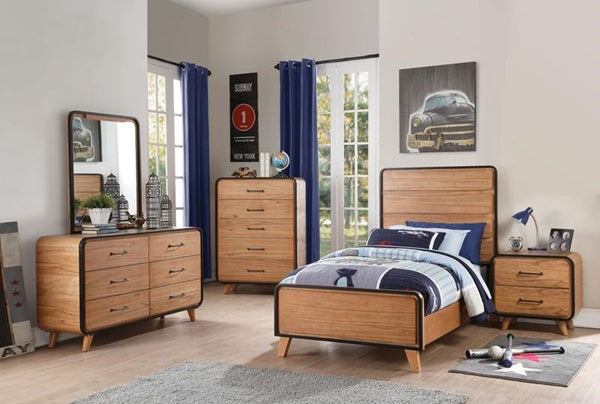 The Carla collection was designed with simple and style for today's modern youth. This look combines a simple and urban look with comfortable styling shown in the graceful raised panel HB/FB of the bed with black trim. Add the spacious dresser, two-drawer nightstand and five-drawer chest for tons of storage space. This Carla collection will be the great piece for your youth room.