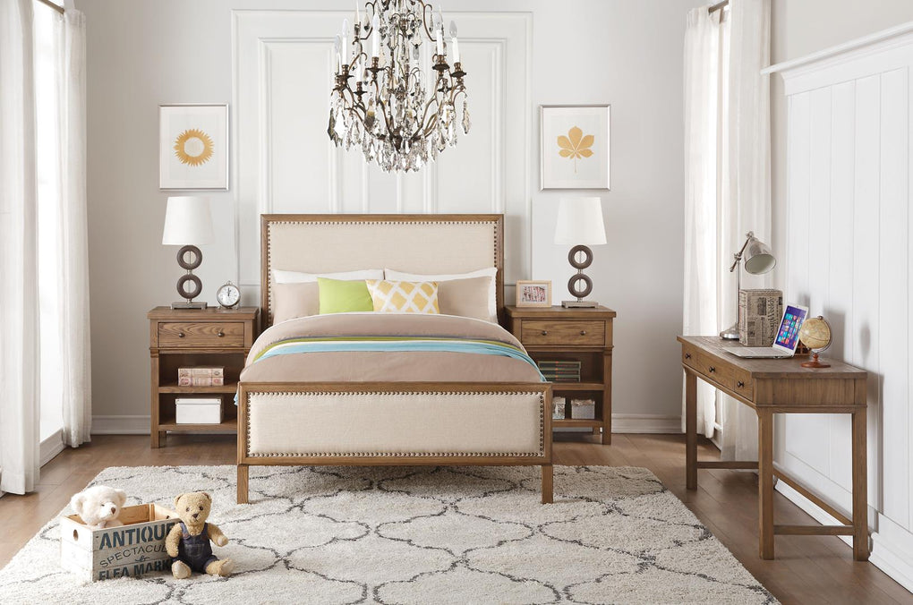 Inverness bedroom set will bring you back to 8th-century French furnishings environment, and crafted in rectangular shape for the whole collection. Upholstered in beige linen headboard and footboard associating with Nailheaded trim, it is a challenge in traditional design to achieve fresh and creative taste. This will be the perfect bedding collection for your little one.