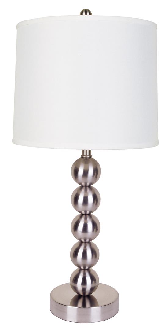 Enhance your room with the Vassy II Table lamp Set of 2. This pair boasts sturdy bases made from metal with a wide, round foot and a center pillar comprised of stacked ball shapes. A metal finish emphasizes the sleek curves of the back. The bulbs are controlled with standard on/off switches with a bright white fabric drum shade to soften the light. Bulbs are not included