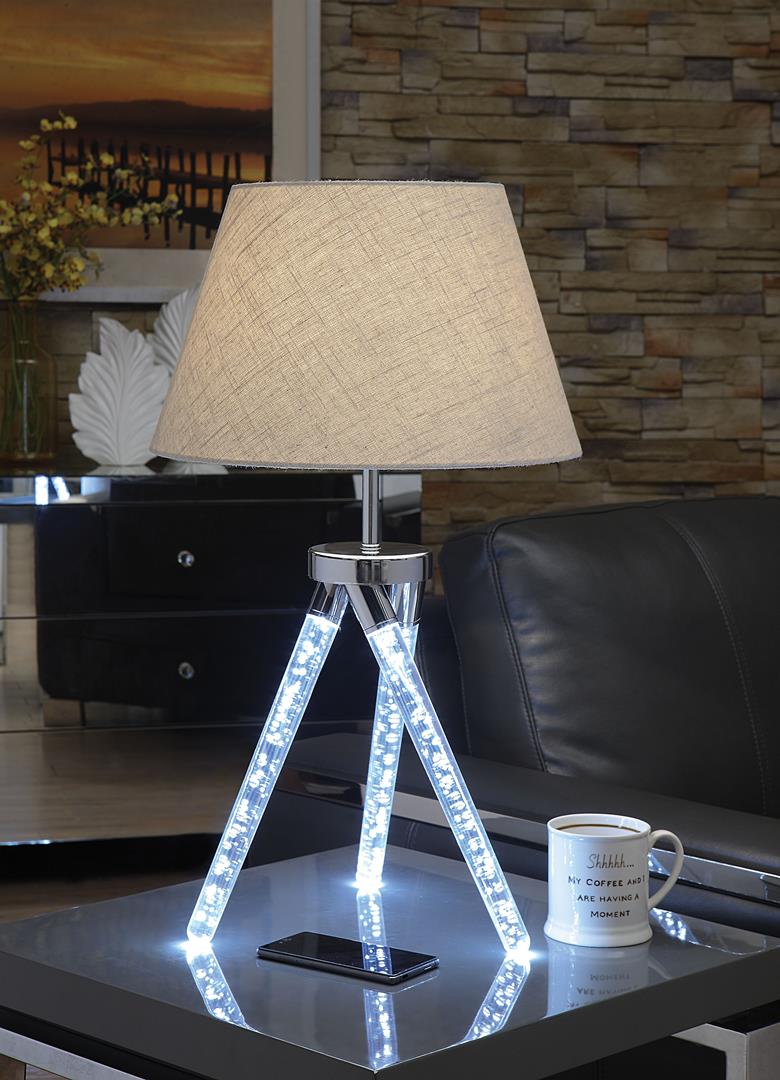 Remarkably shimmering, this Cici sophisticated table lamp will embellish your room to a whole new level. Designed with stylish and superiority in mind, the base is made from high quality acrylic and metal with SMD LED Module. The lamp holds LED light bulb and has 4-way rotary switch to increase its flexibility and functionality. With the luxurious chrome finish and light brown fabric barrel shade, this lamp will blend perfectly in any Decor.