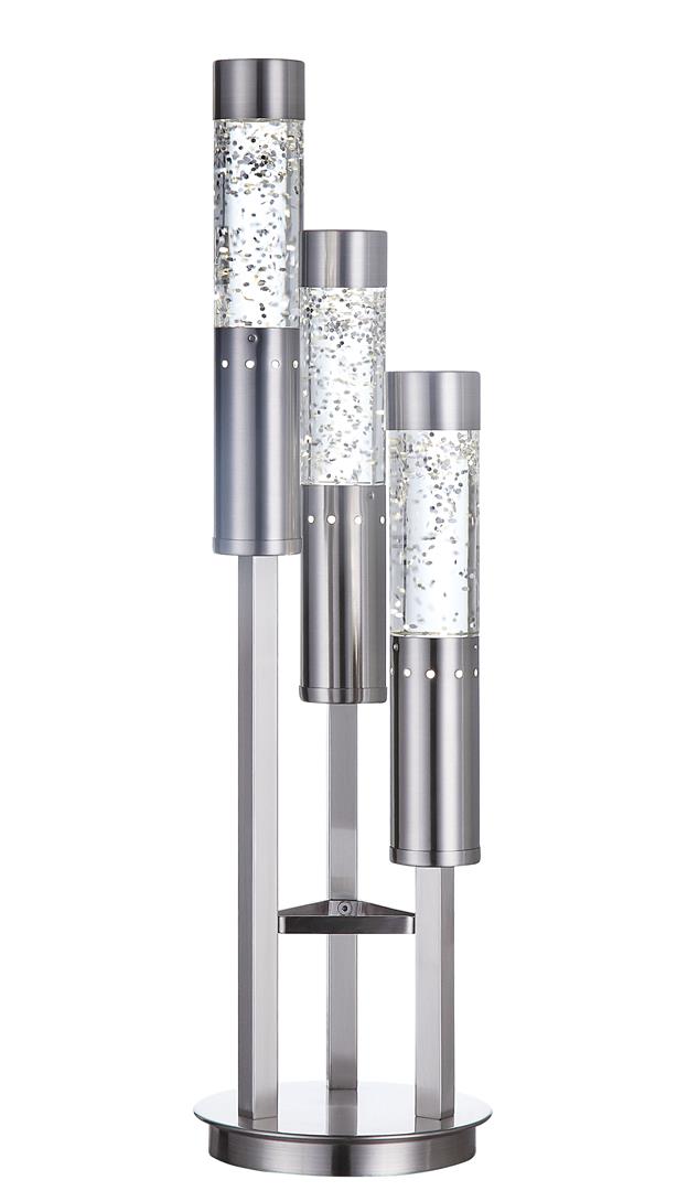 Illuminate your space in style with this Claus lighting collection, a must-have that will add an elegant feel to any room. Featuring a brushed nickel metal base, the construction is sturdy yet stylish. Within the glass tube, there are sequins and water; and the sequins will be flowing once the light is turned on. Unique, beautiful and chic, this lighting collection will add an artful touch and be the centerpiece in any room.