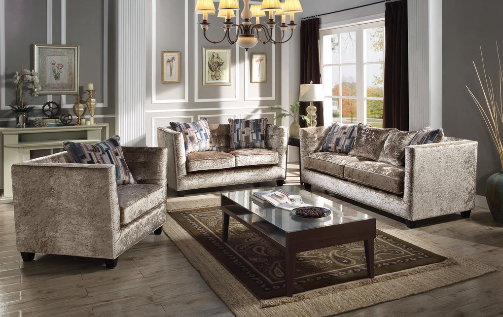 The Juliana collection sofa will bring a streamlined sensation for your living room, characterized by shelter arms, and filled with standard down feather. Also features, Button Tufted Back, wooden block leg, loose seat cushion, and Nailhead trim design. Pillows are included in each part for a better and comfortable back support