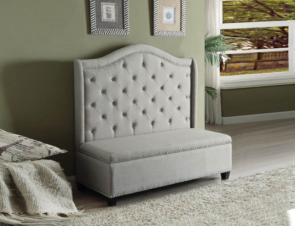 The Fairly collection settee will surely bring high praise from guests to your home. Expertly crafted with selected fabric in solid beige finish. This armless settee features elegant high backrest with camel back shape, Nailhead trim, and is complemented by its functional storage base with wooden legs.
