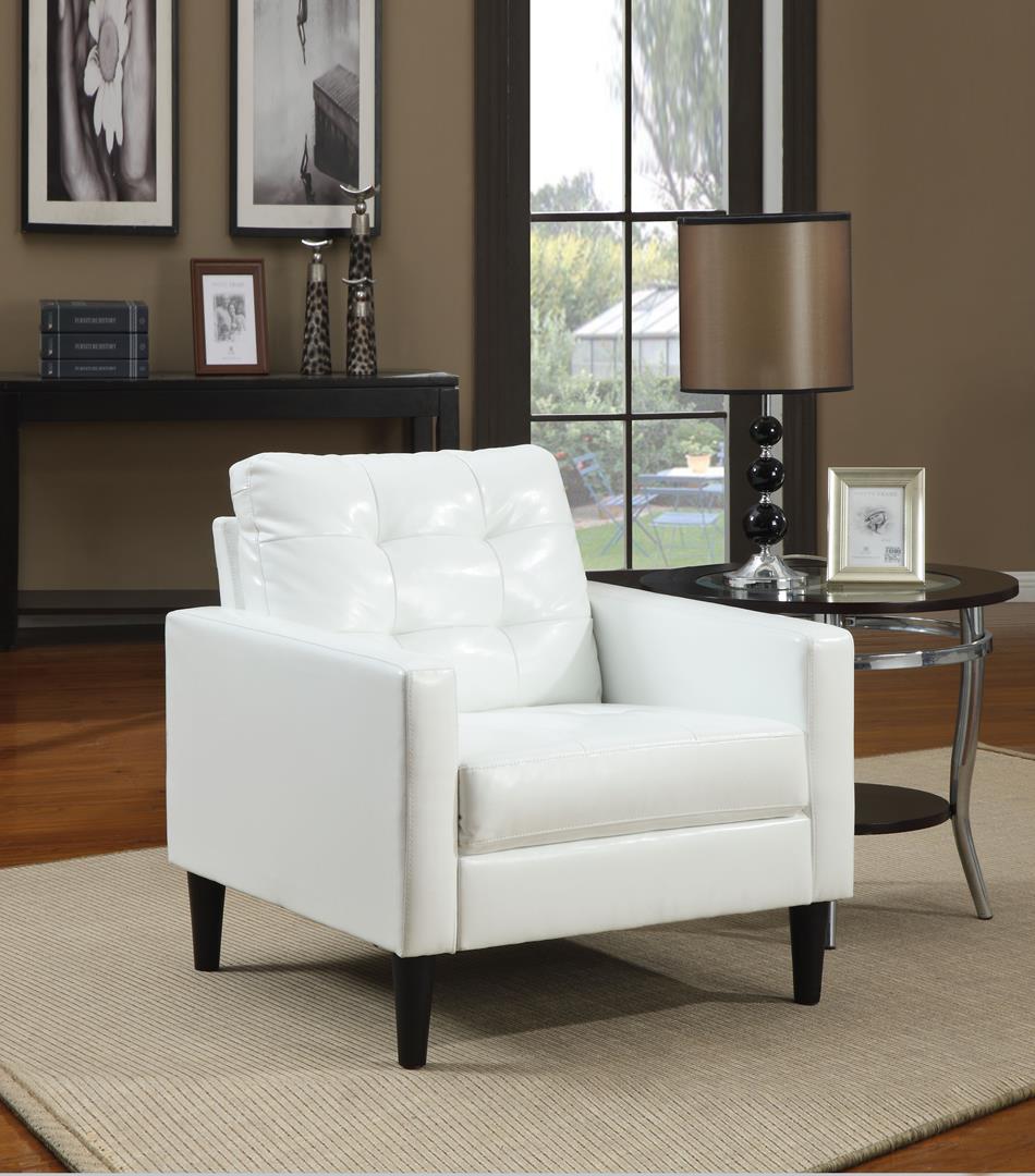 The Balin Upholstered accent chair features strong lines and tufted cushions. The faux leather upholstery is available in Espresso or White Finish. Change your seating and style game with this one piece.