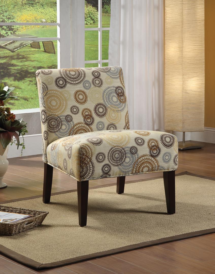The Aberly accent chair features contemporary style, padded back and seat cushion with contrast fabric pattern complemented by espresso finish tapered wood legs. Create elegant and sleek contemporary style that is perfectly suited for any living room environment.