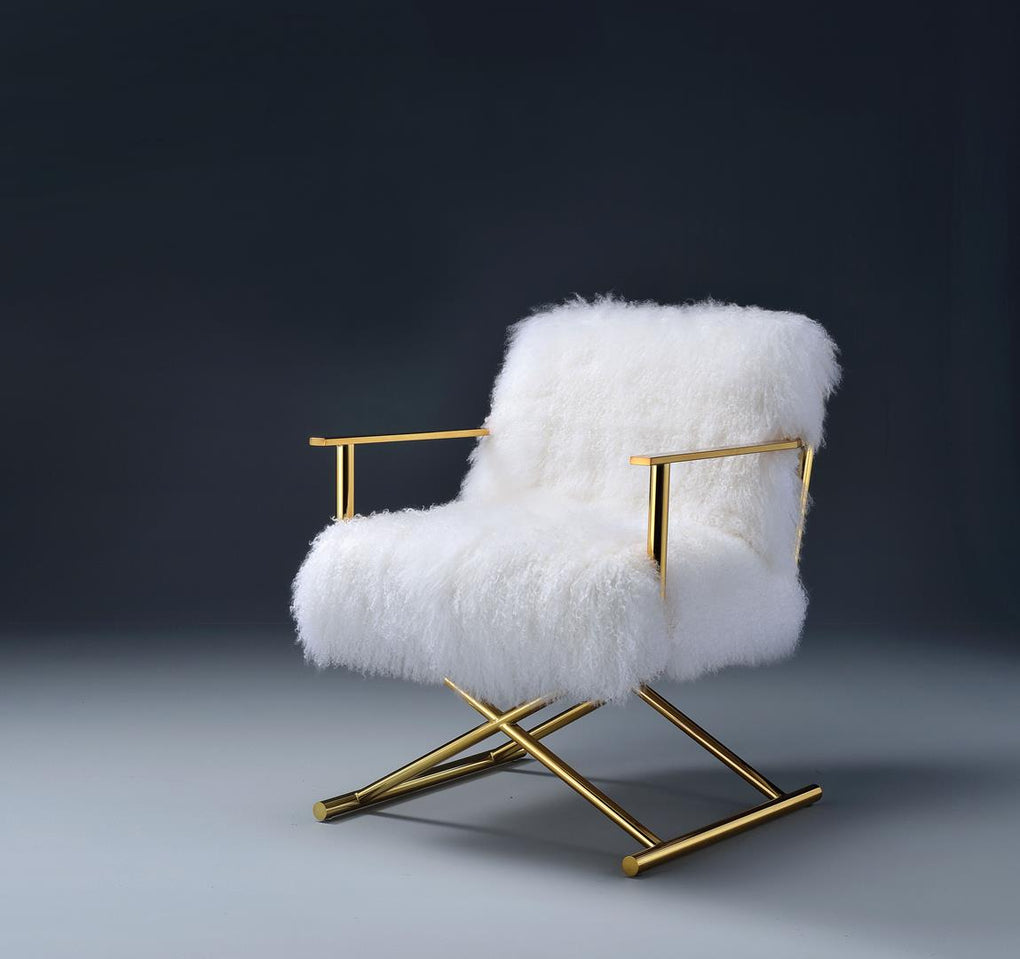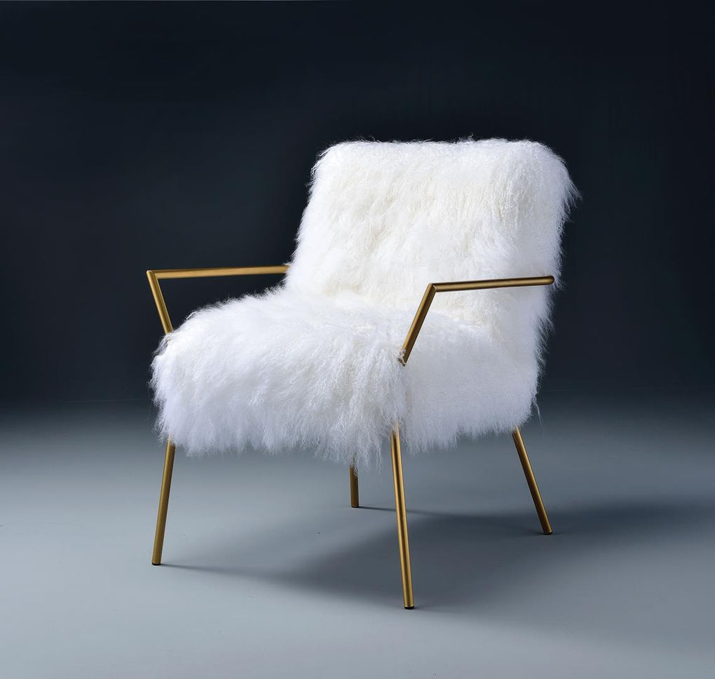 Bring high end style and luxury into your home with the Bagley accent chair, combining hard crisp lines of tubular and rectangular gold painted metal with campaign style feel and the softness and visual appeal of Tibet wool. This accent piece will surely be a topic of discussion, as well as a place for comfort.