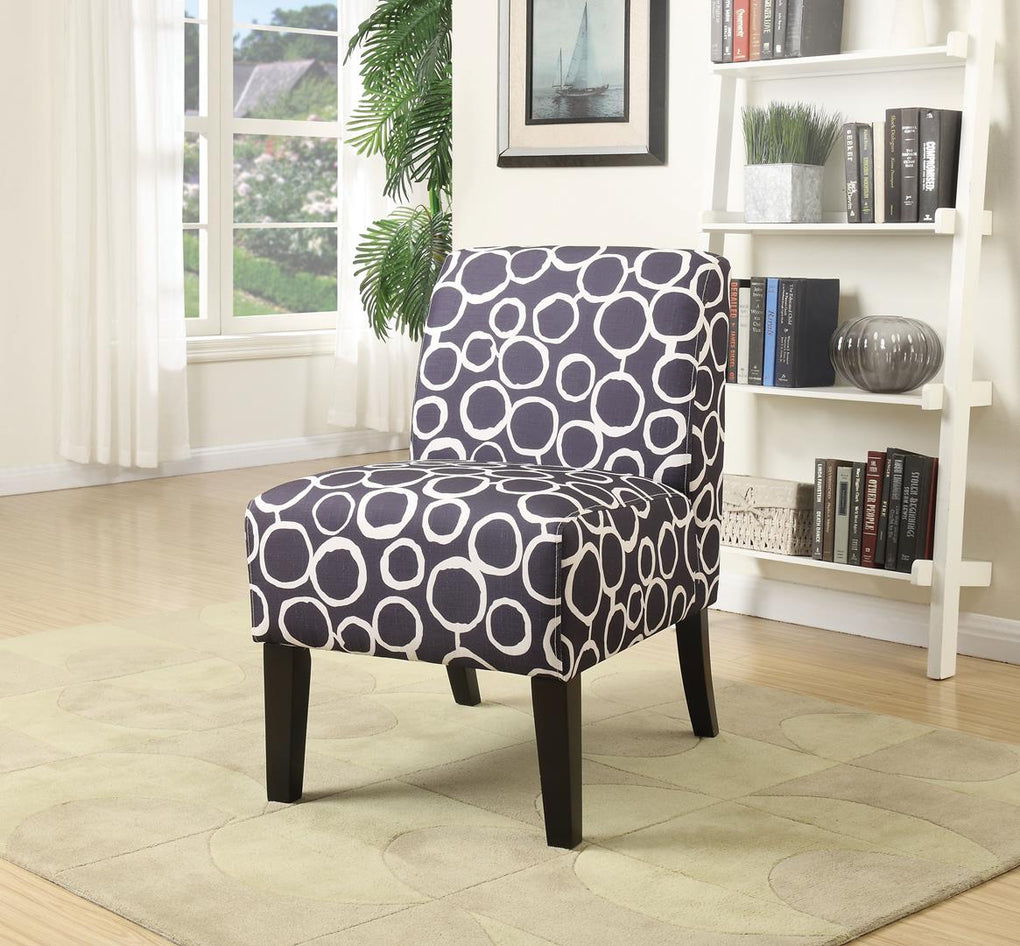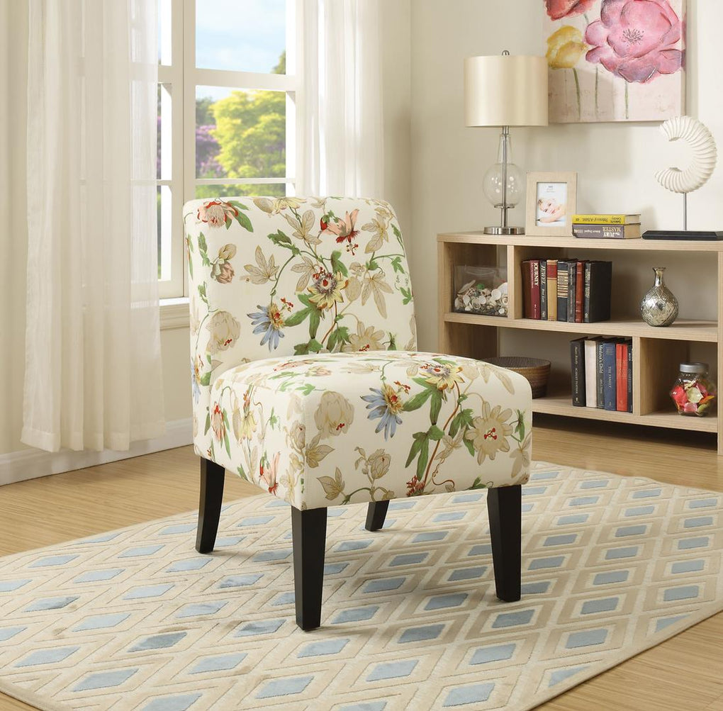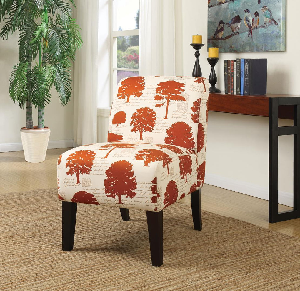 The Ollano armless slipper chair features contemporary style, padded back and seat cushion, covered with selected fabric pattern, and complemented by dark brown finish tapered wood legs. Create elegant and sleek contemporary style that is perfectly suited for any living room environment.