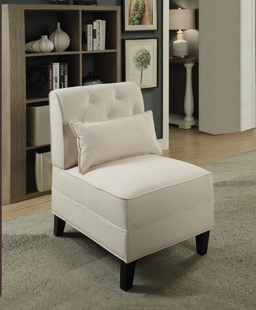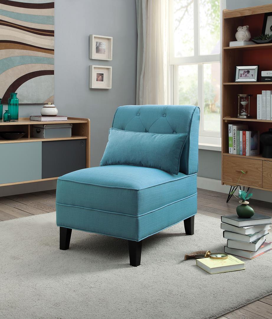 The Susanna armless slipper chair with accent pillow features contemporary style, padded back and seat cushion, button tufted backrest, covered with selected fabric, and its complemented by tapered wooden legs. Create elegant and sleek contemporary style that is perfectly suited for any living room environment.