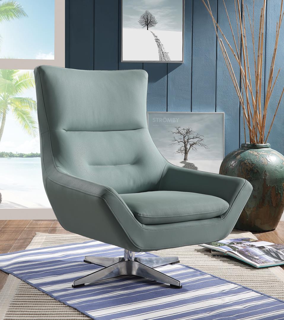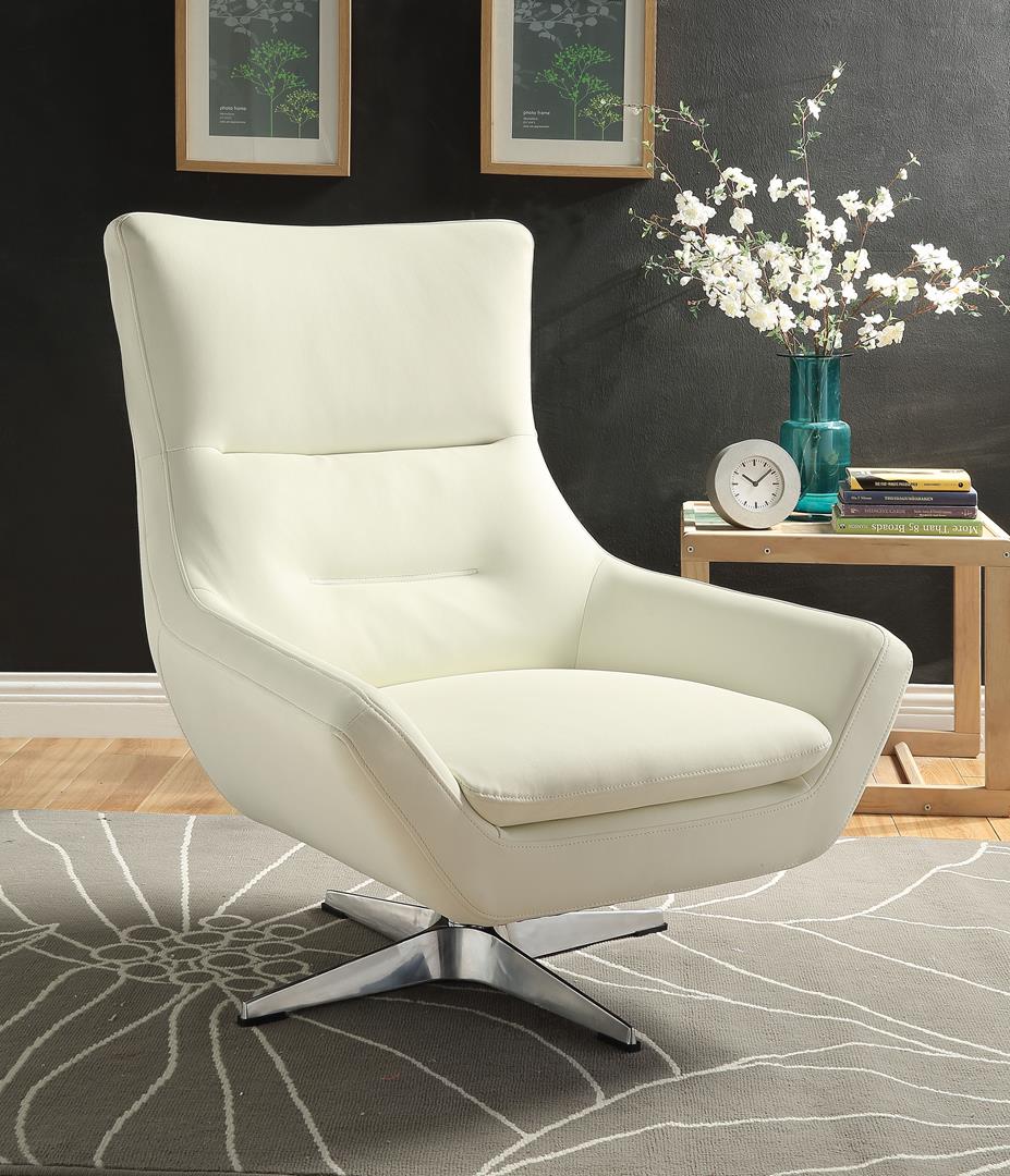 The flair of solid contemporary design is executed immaculately in this Eudora swivel accent chair. Wrapped in white leather gel, it offers an unmatched style with supreme quality. The supported chrome legs and full foam seating furthermore provides long lasting durability and strength. This accent chair will not only deliver ultimate comfort, but will also set the scene in any living space.