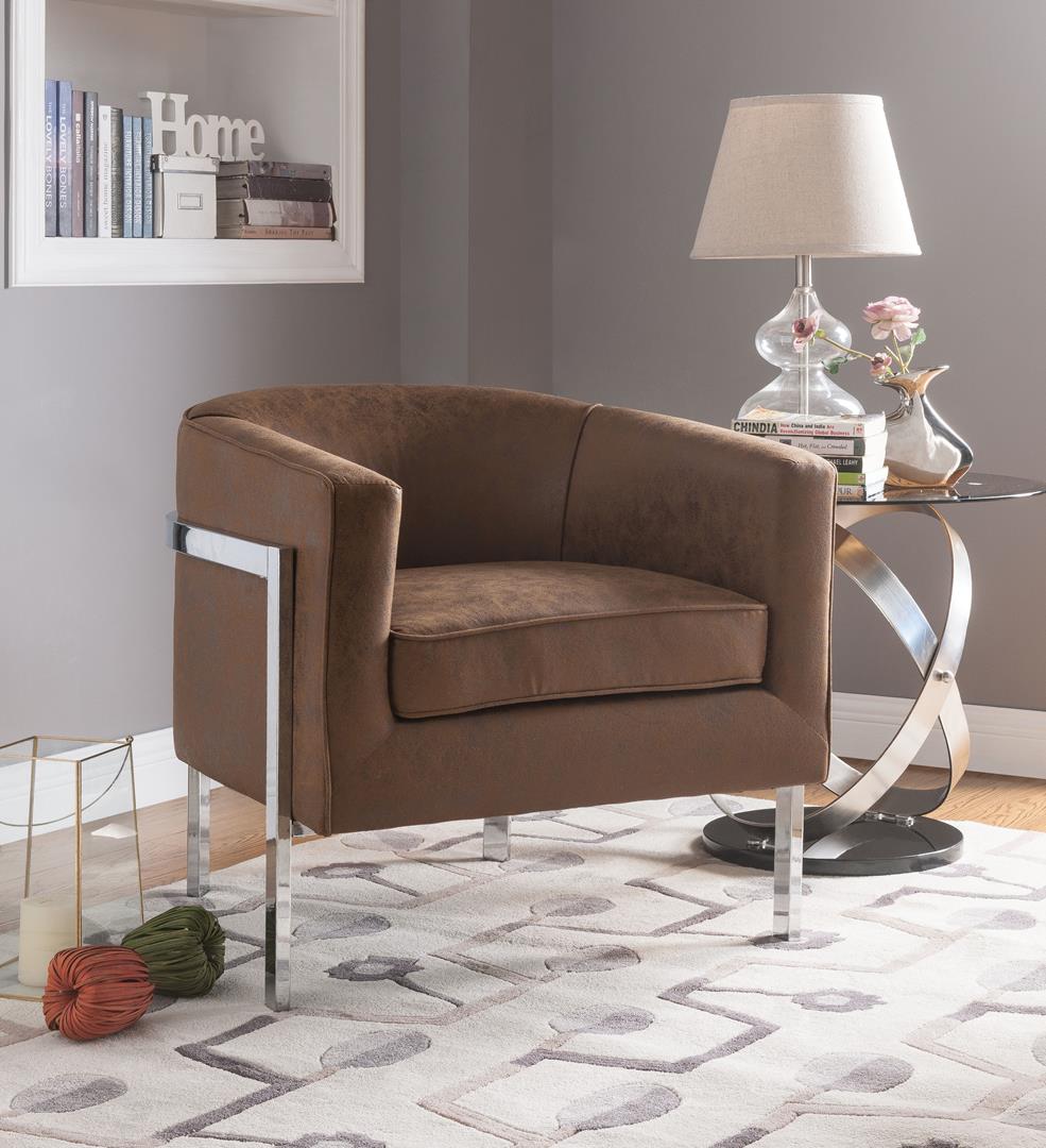 Graphically inspired, the Tiarnan accent chair has an edgy look with its chrome metal leg and modern-influenced styling. Its curved backrest and thick padded seat cushion offer ultimate comfort that is perfect for relaxation. There are two color options available: brown faux leather and gray faux leather.