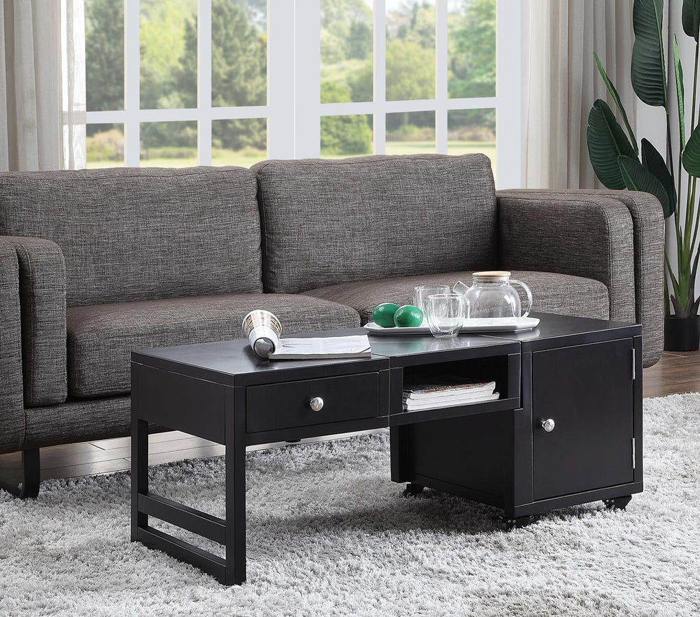 Maximize your living space with the attractive Machiko Coffee Table. Designed for with both function and style, this rectangular occasional table features a rich black finish with metal legs and caster wheels. The minimalist style and neutral color scheme create a contemporary look that will mesh with any existing Decor. The coffee table's foldable style allows it to be changed into a variety of different configurations, providing multiple options and usages. With a cabinet, open shelf and drawer, the table provides ample display and storage to keep items tucked out of the way when not in use. Make the most of your space with this attractive coffee table that brings a modern touch to any room.
