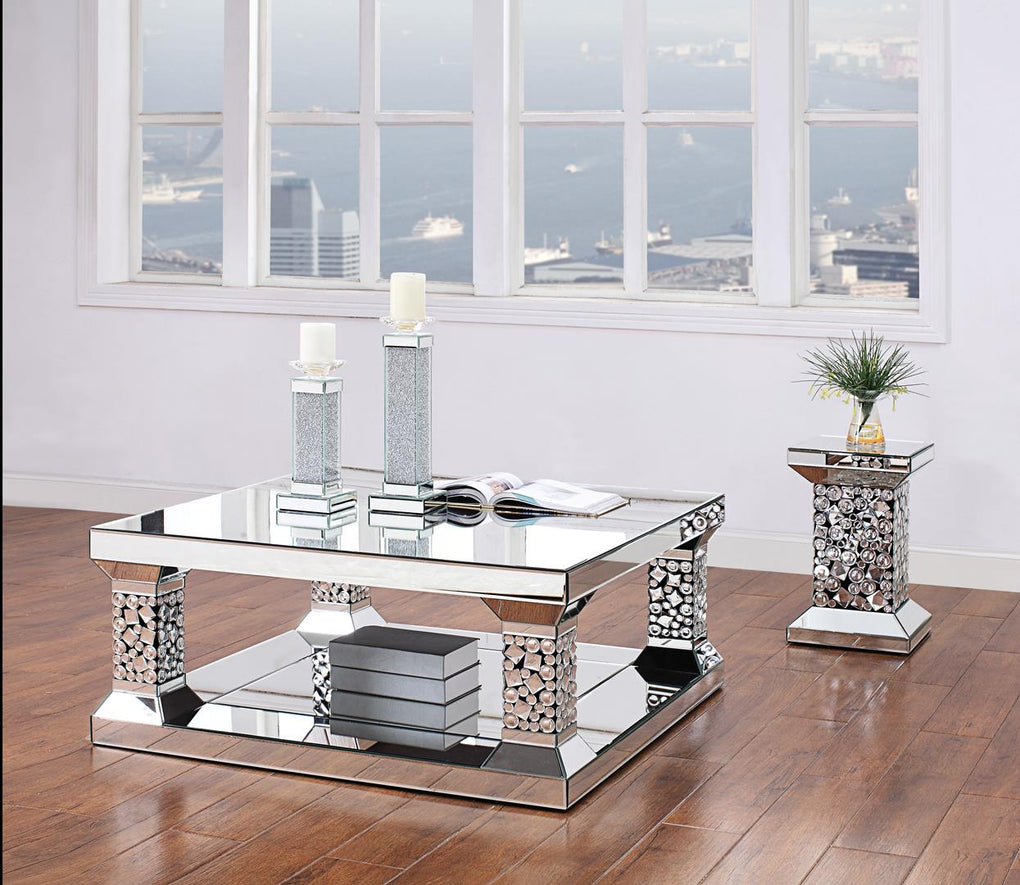 The Kachina Coffee Table will add a contemporary touch to any room in your home. With its clean lines, this brilliant rectangular occasional table showcases a distinctive style for an intriguing look. The table features a fully mirrored beveled frame with mirror base with columns encrusted with a spectacular faux gem inlay. A lower mirrored open shelf provides ample display and storage to keep items tucked out of the way when not in use. This beautiful accent table will modernize any space you place it.