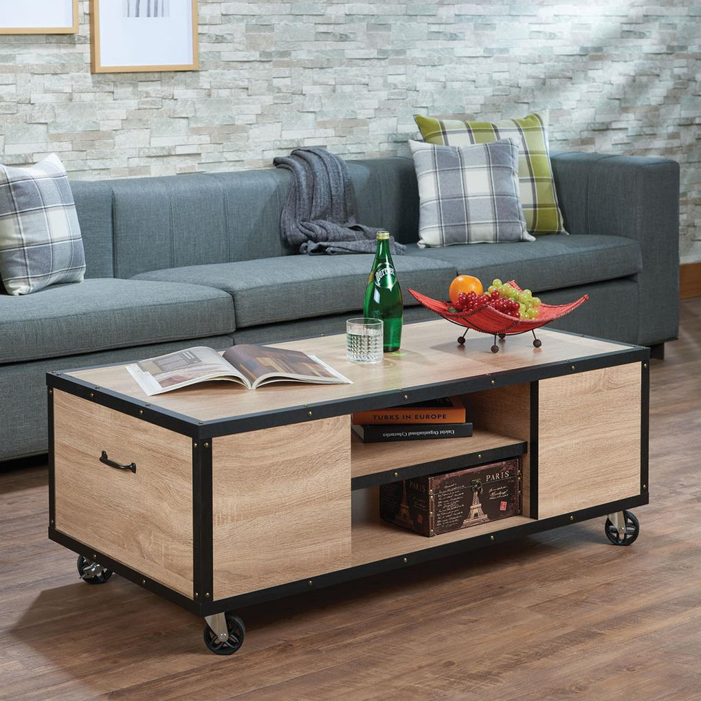 Storage function and mobility is what you need in your living room. Feel good knowing you have a place to put your often read books, remotes and other items with the Bemis, a durable look with its all around riveted accent around light weathered oak and casters for easy moving. This coffee table offers drop down end storage 2 middle spaces.