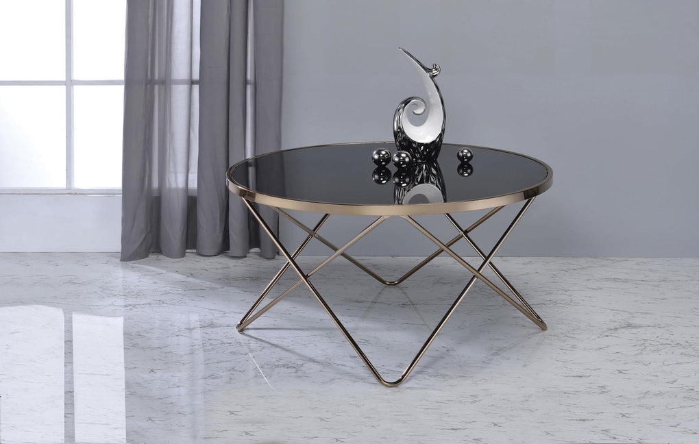 Update your living room with a functional art piece. The Valora coffee table uses a mid-century inspired base finished in champagne and supports a framed black glass top. The finish and black glass make for a sophisticated look.