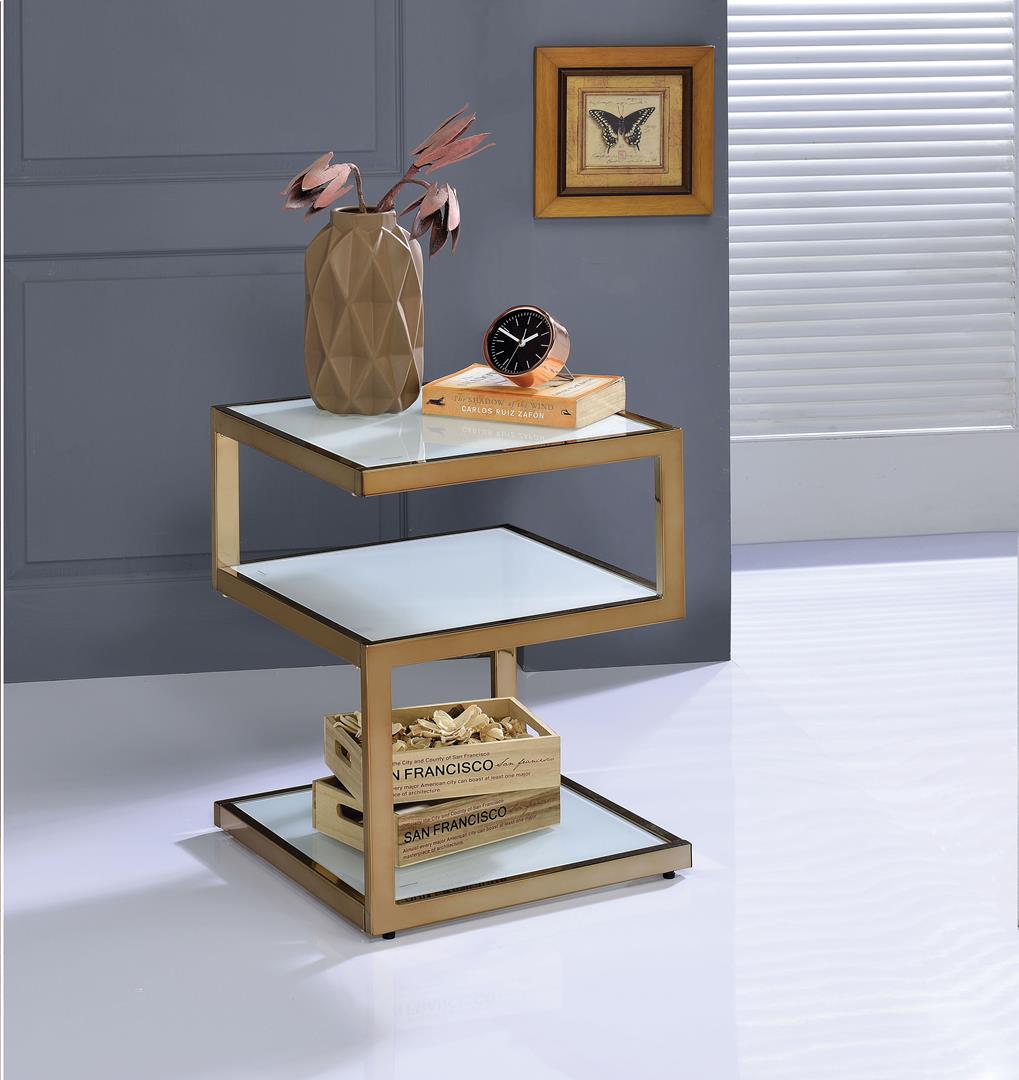 The Alyea occasional table collection its a balancing act of sorts. This unique table is fun and functional, features 3 tier shelves design. The mix of frosted glass and champagne metal make this a wonderful addition.