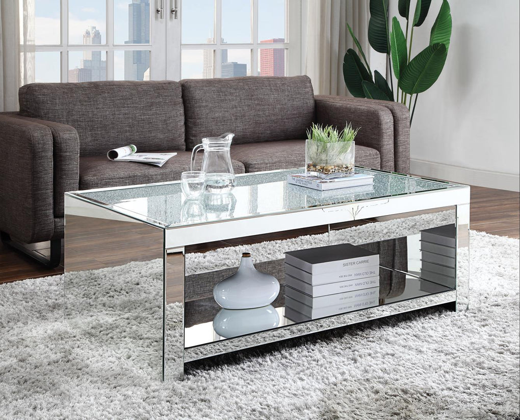 The Malish Coffee Table will add a contemporary touch to any room in your home. With its clean lines, this brilliant rectangular occasional table showcases a distinctive style for an intriguing look. The table features a fully mirrored beveled frame and tempered glass top with a magnificent mirrored sled base. An open bottom shelf provides ample display and storage to keep items tucked out of the way when not in use. This beautiful accent table will modernize any space you place it.