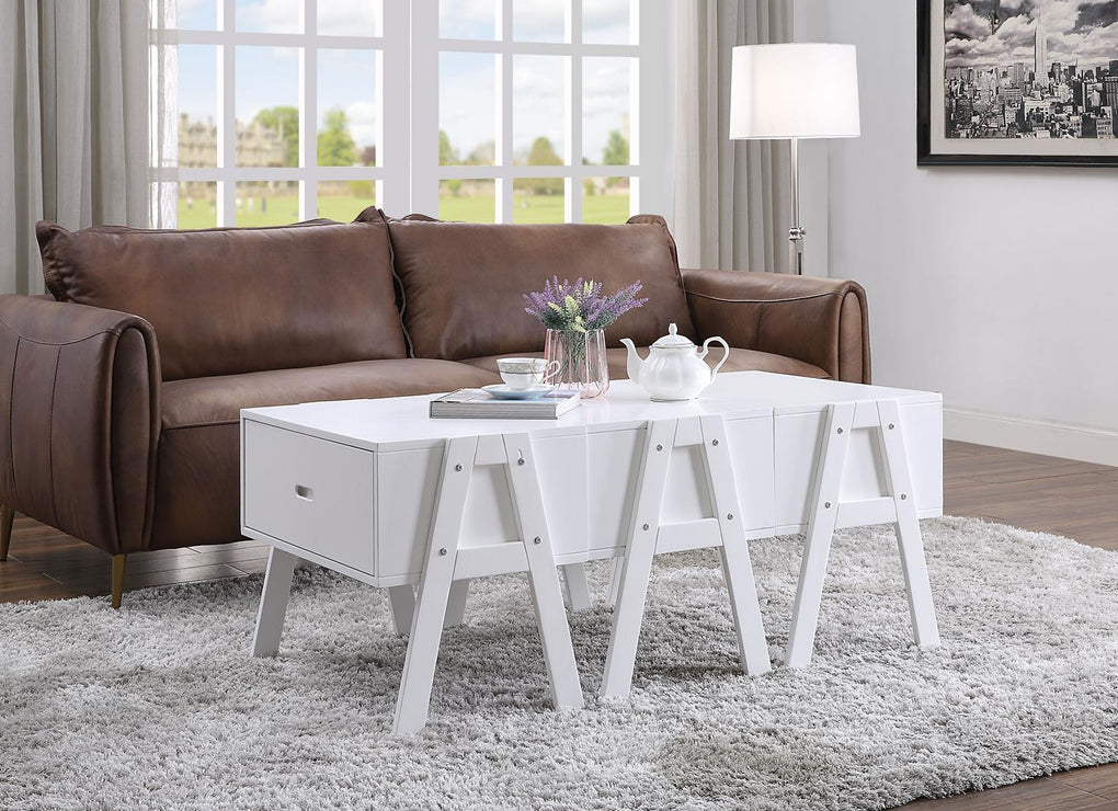 Maximize your living space with the attractive Lonny Coffee Table. Designed for with both function and style, this rectangular occasional table features a rich white finish on a wood frame with angled wood legs. The minimalist style and neutral color scheme creates a contemporary look that will mesh with any existing Decor. The coffee table's foldable style allows it to be changed into a variety of different configurations, providing multiple options and usages. Three drawers provide ample display and storage to keep items tucked out of the way when not in use. Make the most of your space with this attractive coffee table that brings a modern touch to any room.