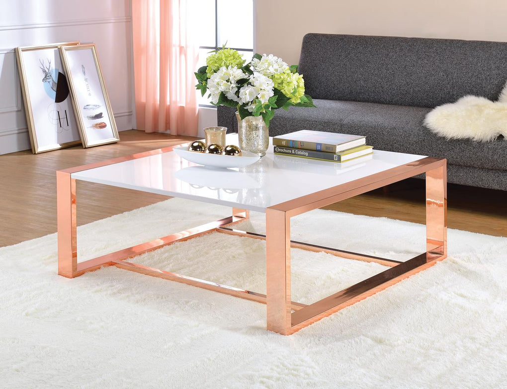 Add a dash of elegance with the Porviche coffee table. This rectangular table features a trendy rose gold finished base and a white glossy top. It will create the perfect centerpiece for any living room or den.