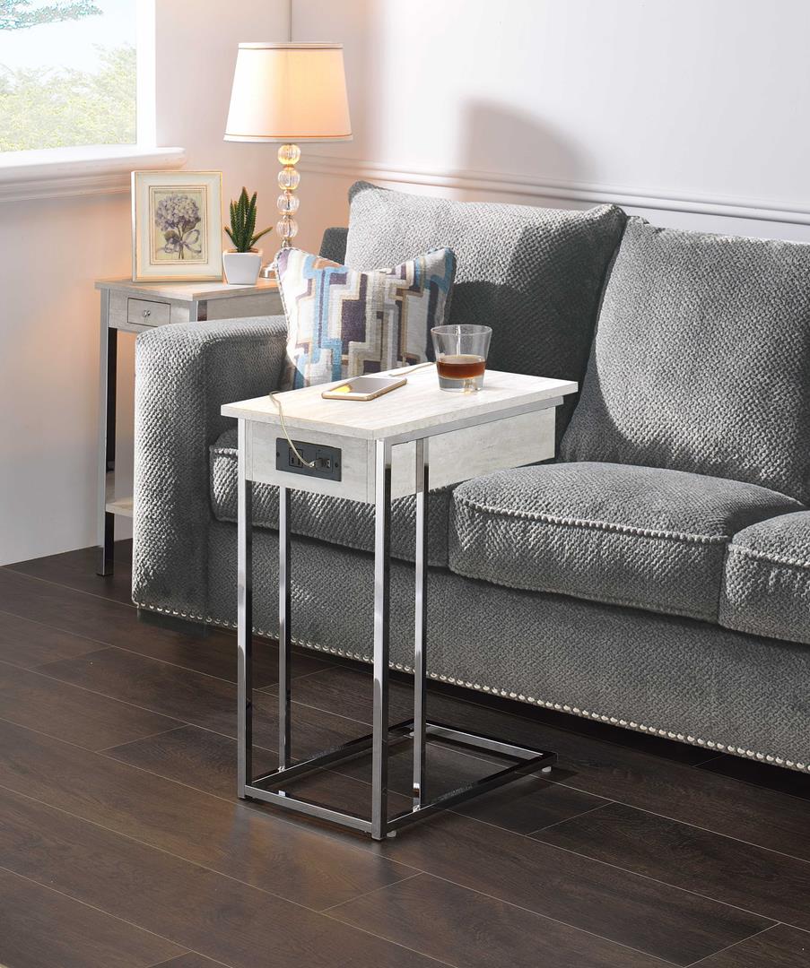 This Hamilin side table is brimming with a modern style that pairs a minimalist motif with functionality. With a metal tube, geometric c-shaped base and particle board table top, offer study support with spacious top. USB charging port and three-prong power outlet provide easy power access for you to charge your device. Simple yet practical, this table is perfect for any home décor.