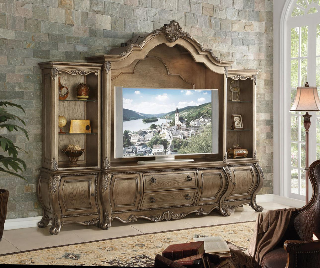 The Ragenardus the entertainment center was inspired by old European design. This collection features arched scrollwork accent on the bridge's crown. The collection pieces are carefully crafted with selected wood, veneers and poly-resin in vintage oak finish with hand brush gold accents. Offers regal features such as touched light, glass doors and shelves, and antique finish hardware. This entertainment center will give a royal sensation to your living room. (TV Stand Sold Separately)