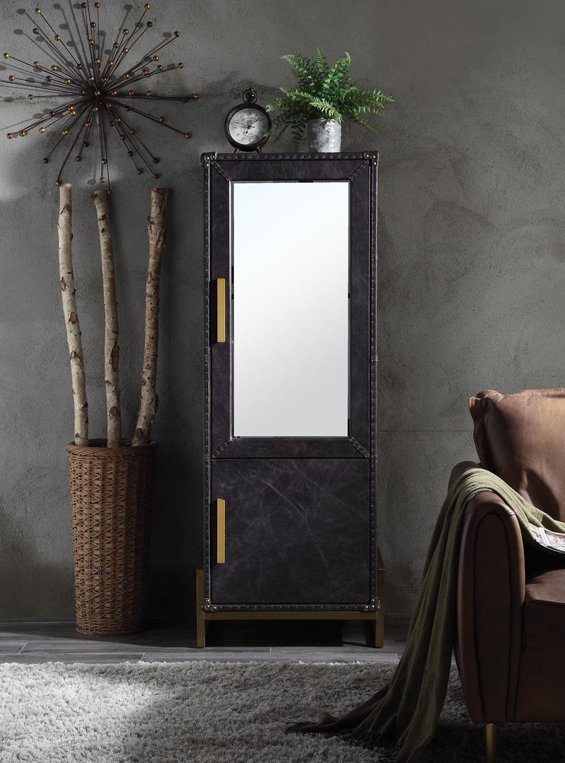 Redefine your space with a modern look and industrial styling with the Keegan Side Pier. This rectangular unique accent piece features a magnificent antique ebony top grain leather wrapped frame with riveted corners, nail-head trim, and a sturdy metal sled base. The stunning pier top features a mirror door with two large shelves and an additional lower cabinet for ample storage. This beautiful accent piece will modernize any space you place it.